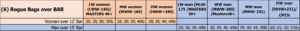 The athletes will attempt to throw 4 Rogue Bags iwith increasing weight (see weight chart below) over bar (12’ for women 15’ for men). Athlete will have 60 seconds time limit to complete all 4 bags over bar. Most successful throws in least amount of time wins